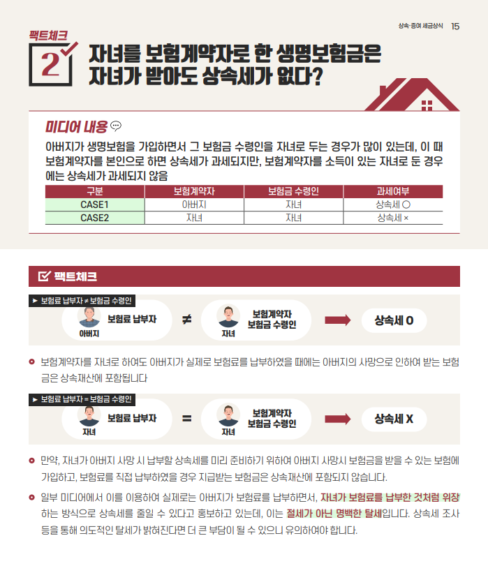 두 번째 팩트에 대한 체크입니다. 자녀를 보험계약자로 한 생명보험금은 자녀가 받아도 상속세가 없다에 대한 팩트체크입니다. 수령인이 자녀이고 납부자가 아버지였다면 상속세를 내야 합니다. 그리고 수령인이 자녀인데 자녀가 납부를 했다면 상속세는 없습니다. 하지만 자녀가 보험료를 납부한 것처럼 위장하는 방식으로 상속세를 줄일 수 있다고 말하지만 이는 절세가 아니 명백한 탈세입니다.