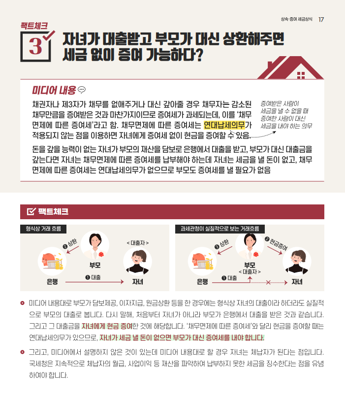 세 번째 팩트에 대한 체크입니다. 자녀가 대출을 받고 부모가 대신 상환해 주면 세금 없이 증여가 가능한지에 대한 팩크체크입니다. 부모가 담보제공, 이자지급, 원금상환 등을 한 경우에는 형식상 자녀의 대출이라 하더라도 실질적으로 부모의 대출로 봅니다. 다시 말해 처음부터 자녀가 아니라 부모가 은행에서 대출을 받은 것과 같습니다. 그리고 그 대출금을 자녀에게 현금 증여한 것에 해당합니다.