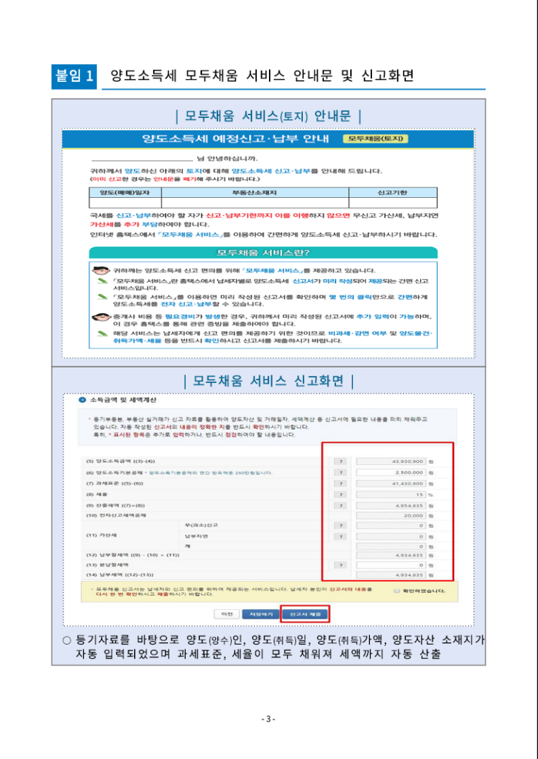 붙임 1은 양도소득세 모두채움 서비스 안내문 및 신고화면입니다. 내용을 확인하시기 바랍니다.