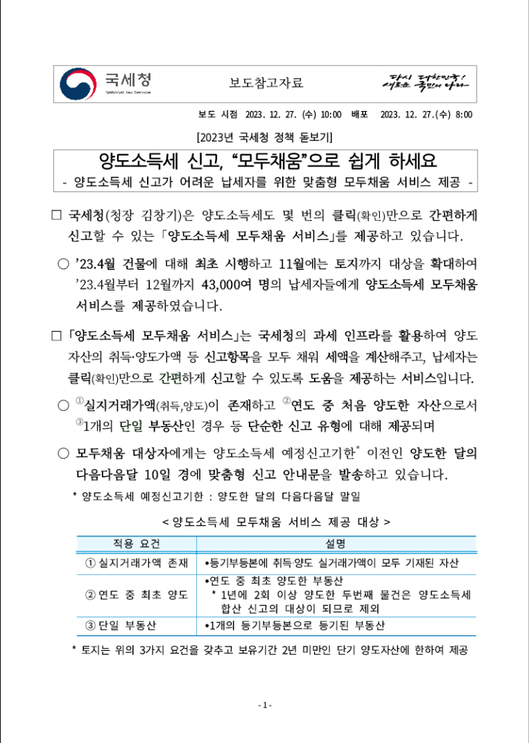 1. 양도소득세 모두채움 서비스 대상은 단일 건물이나 단일 토지를 양도한 후 납부할 세액이 있을 것으로 추정되는 납세자이고 대상자에게는 신고 안내문이 발송된다고 합니다.
