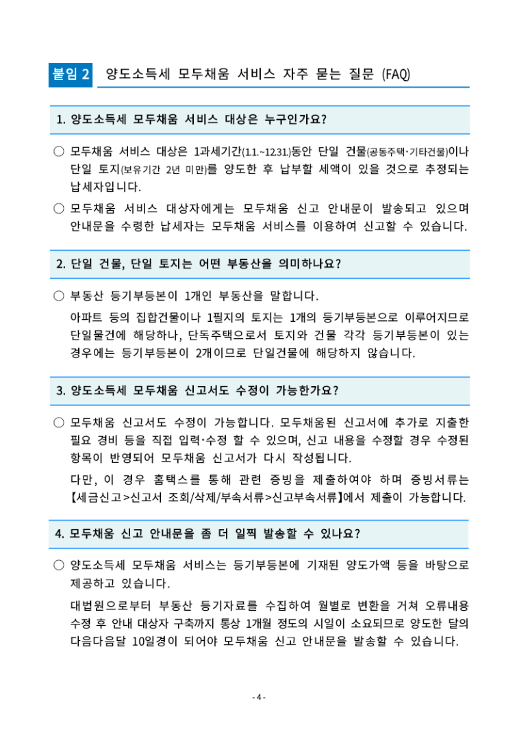 붙임 2는 양도소득세 모두채움 서비스 자주 묻는 질문내용입니다.