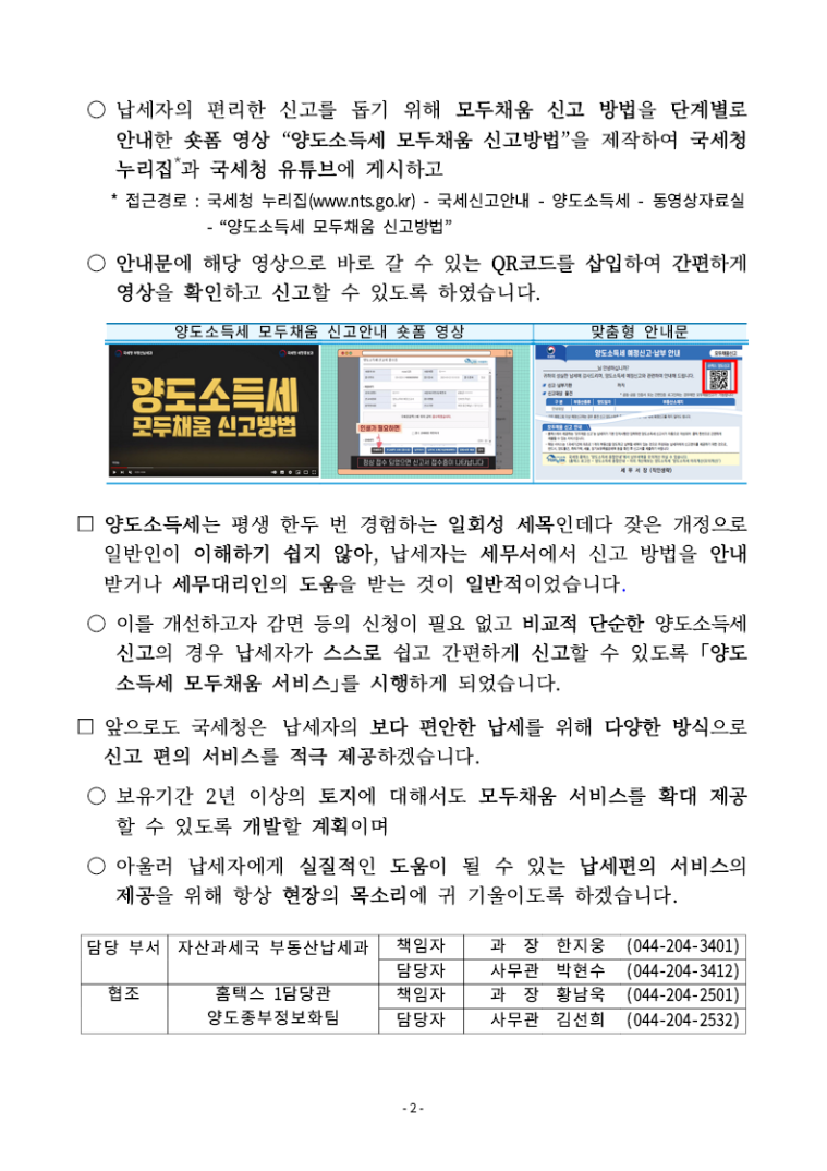 모두채움 신고 방법을 단계별로 안내한 숏폼 영상 "양도소득세 모두채움 신고방법"을 제작하여 국세청 누리집과 국세청 유튜브에 게시하고 있습니다. 자세한 내용은 아래 공고내용을 확인하시기 바랍니다.