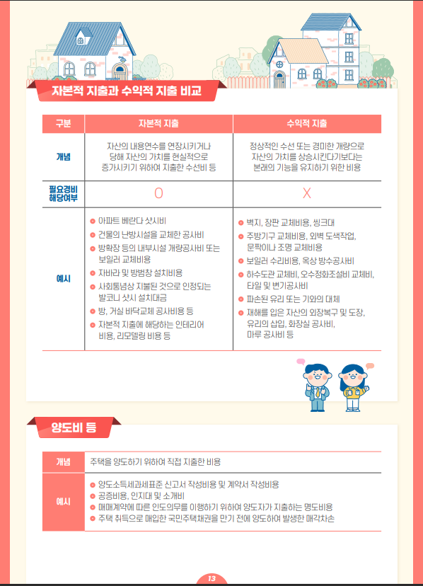 베란다 새시, 난방시설을 교체한 공사비 등 자본적 지출액과 취득당시와 양도당시에 발생한 중개수수료는 필요경비로 공제 가능합니다. 그러므로 신용카드매출전표, 현금영수증, 세금계산서, 종이계산서 등 증명서류를 잘 보관해 놓아야 합니다.
