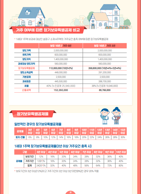 2021년 1 월 1일 이후부터 1세대 1 주택자가 2년 이상 거주한 주택을 양도할 경우 보유기간 및 거주기간에 대해 연 4%(최대 80%)의 장기보유특별공제를 받을 수 있지만 2년 이상 거주하지 않은 경우에는 보유기간에 대해서만 연 2%(최대 30%)의 장기보유특별공제를 받을 수 있다는 내용을 잘 숙지해야 합니다.
